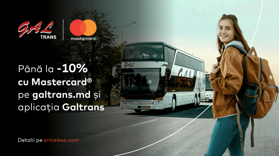 Mastercard та GAL Trans — надійні партнери тих, хто обирає безпечні та комфортні поїздки — запускають нову кампанію для пасажирів, які надають перевагу цифровим платежам. Незалежно від того, їдеш ти на навчання, роботу чи у відпустку, тепер маєш ще одну причину обрати GAL Trans: у період з 1 листопада 2025 року по 31 жовтня 2026 року всі квитки, оплачені онлайн карткою Mastercard®, отримують знижку до 10% на будь-який напрямок.Акція діє для квитків, придбаних на сайті www.galtrans.md або через мобільний додаток GAL Trans і оплачених карткою Mastercard. Знижка застосовується автоматично під час оплати — без промокодів чи додаткових кроків.Розмір знижки залежить від типу картки, використаної для оплати:• 7% — для карт Mastercard® Standard• 10% — для карт Mastercard® PremiumКвитки, придбані у касах або на автостанціях, не беруть участі в акції.Детальніше про кампанію — за посиланням:https://www.priceless.com/travel/product/219551/calatoreste-mai-avantajos-cu-mastercard?country=mdЗавдяки цій ініціативі Mastercard та GAL Trans дарують пасажирам безцінний досвід подорожей. З нами навіть найдовші дороги здаватимуться коротшими, адже цифрові платежі — це не лише швидкість і безпека, але й реальна економія.Про GAL TransЗаснована у 1992 році компанія GAL Trans (Galiz-SV SRL) розпочала діяльність лише з трьома автобусами та чіткою місією — забезпечувати безпечні, комфортні та надійні поїздки. Сьогодні GAL Trans володіє сучасним парком із понад 80 транспортних одиниць, які відповідають європейським стандартам, і обслуговує широку мережу регулярних маршрутів.Про MastercardMastercard об’єднує людей, бізнеси та спільноти більш ніж у 200 країнах і територіях, надаючи їм доступ до світу можливостей. Завдяки стратегічним підходам та постійним інноваціям ми розробляємо цифрові платіжні рішення, які роблять повсякденне життя простішим, безпечнішим та доступнішим.Наші технології, інновації та глобальні партнерства створюють інтегровану екосистему рішень, що підтримують людей, компанії та державні установи, допомагаючи їм розвиватися і досягати максимального потенціалу.